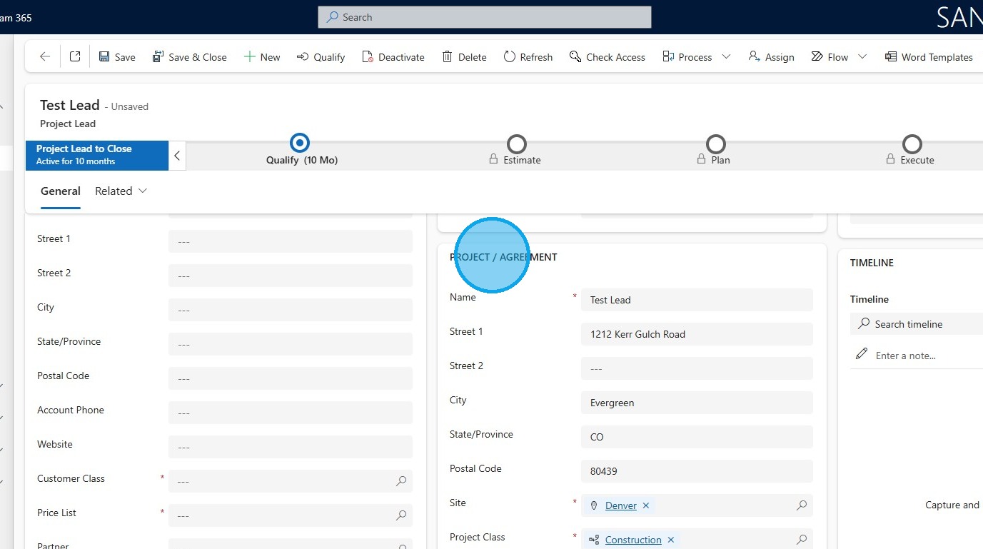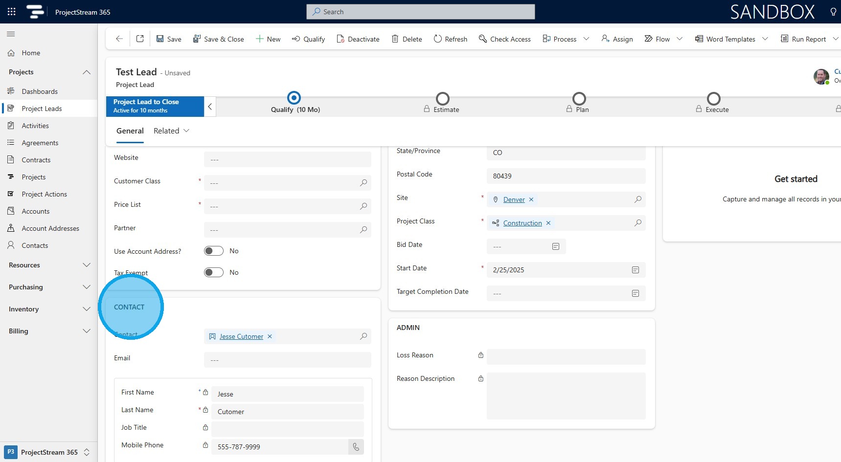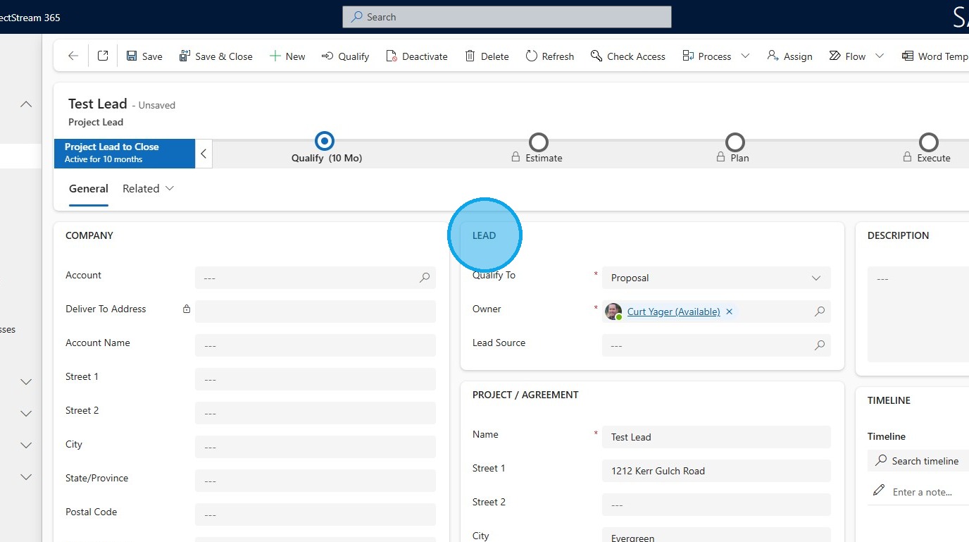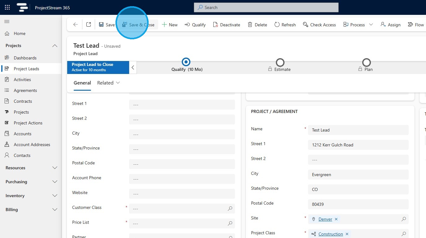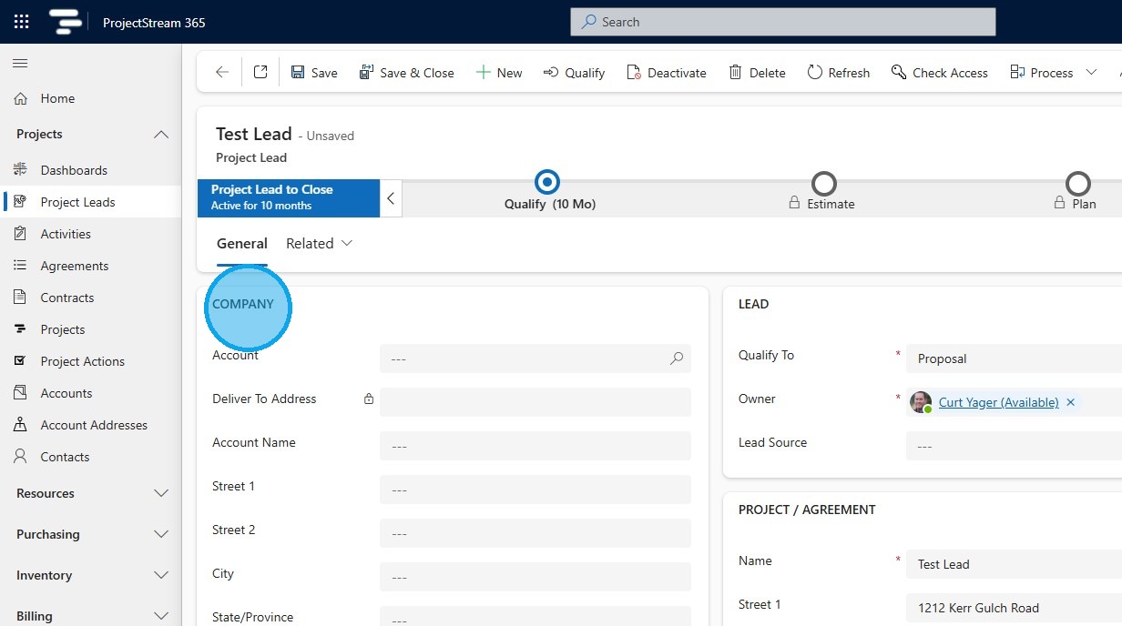Project Leads track unqualified sales opportunities in ProjectStream 365. Salespeople can perform and track qualification activities against the lead. They can choose to Qualify or Disqualify that lead. Upon qualification, the lead is converted to Account, Contact, and/or new Proposal records in ProjectStream 365.