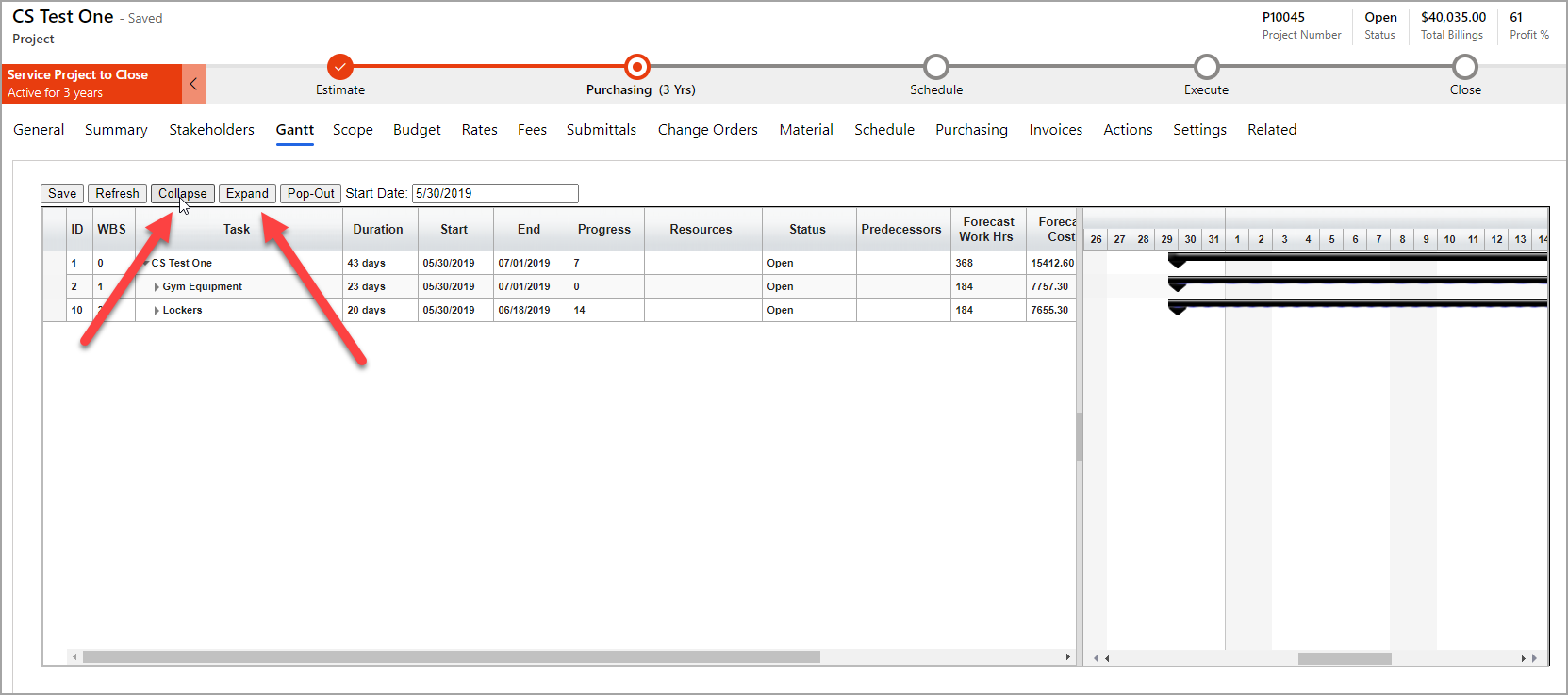 - To collapse all parent tasks, select Collapse, located at the top left of the Gantt Chart